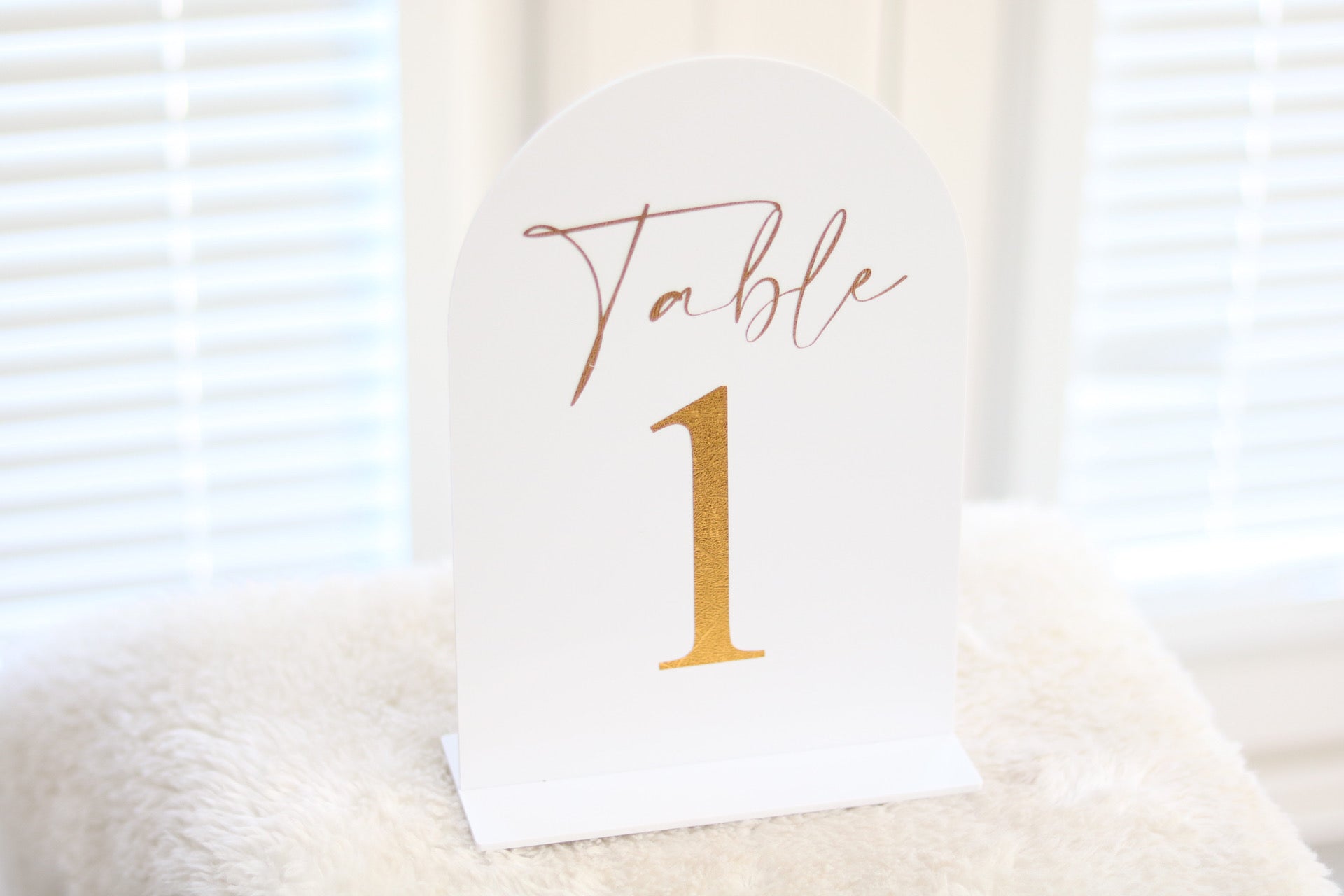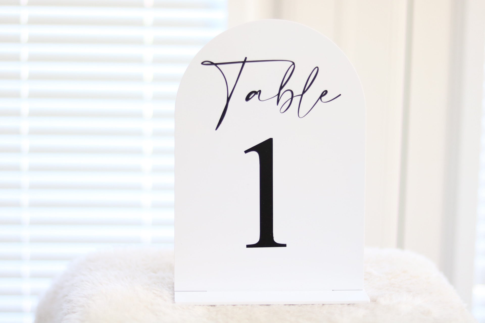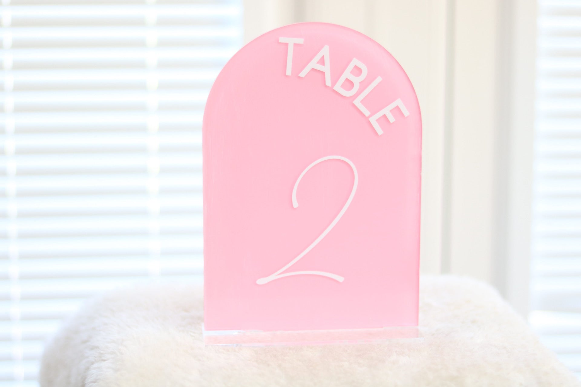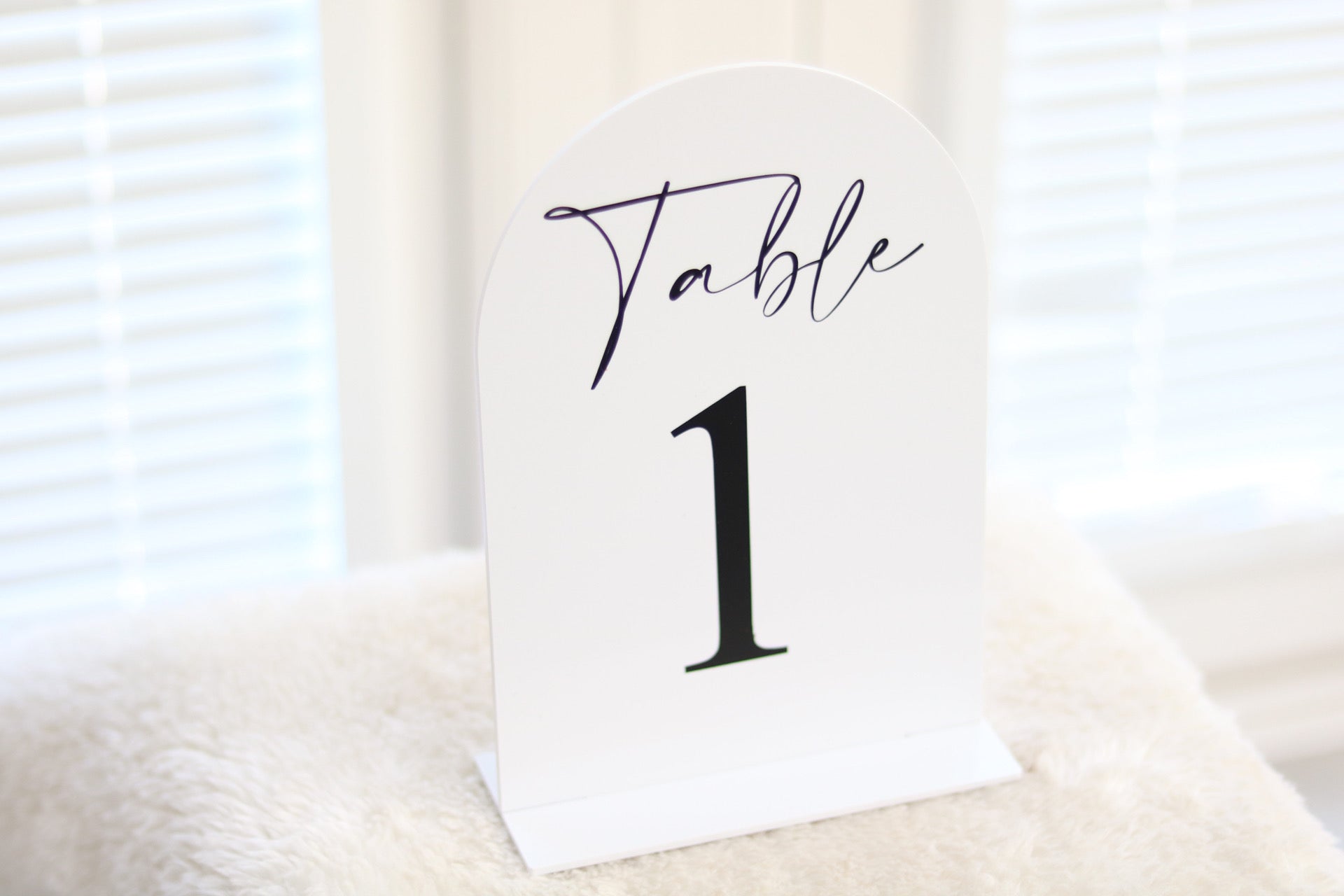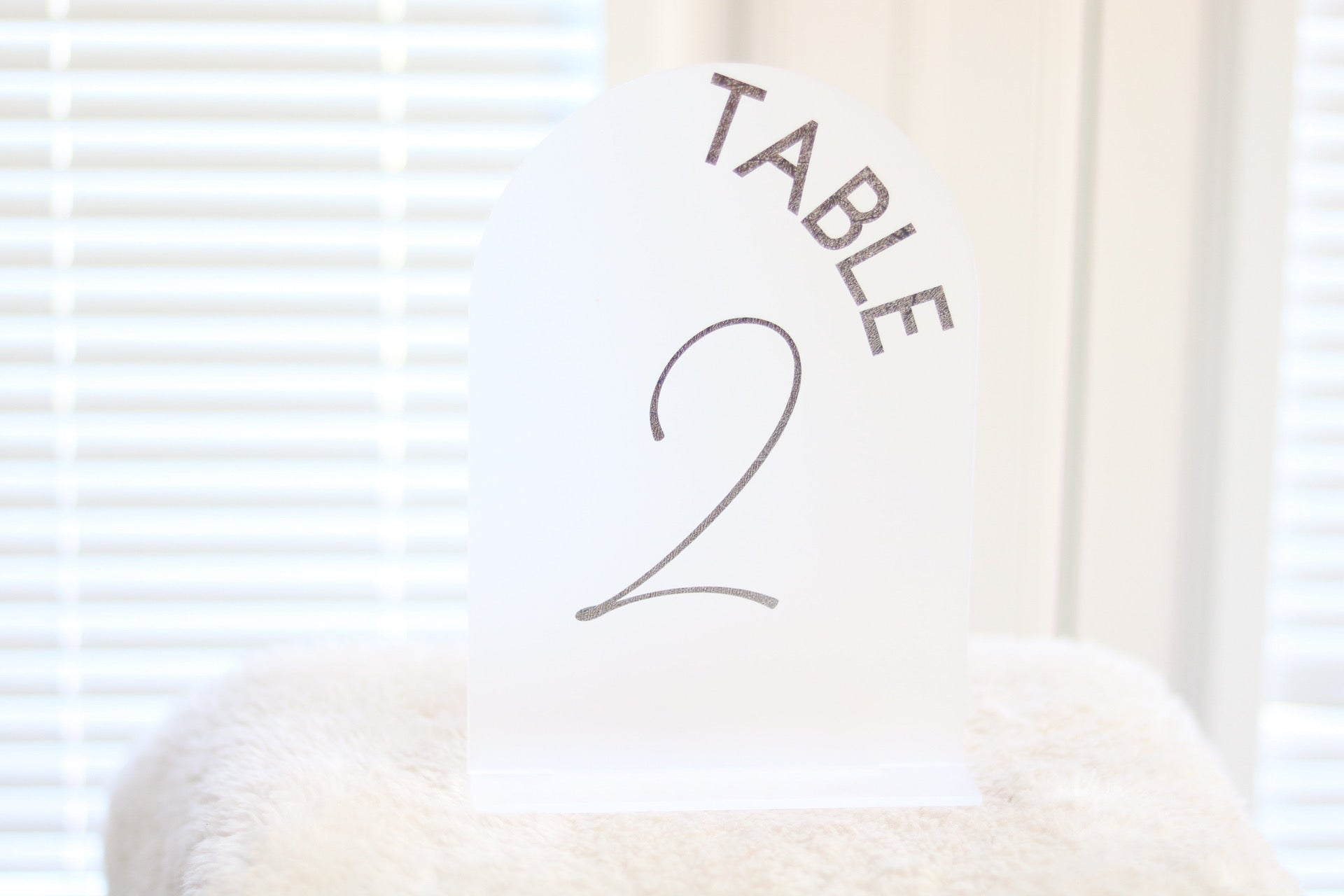 The table numbers come with stands that are easy to use so they sit pretty on the tables. These stands are made from acrylic (the same material and colour as the arch). The only exception is handed painted table numbers as the stands will be left clear.