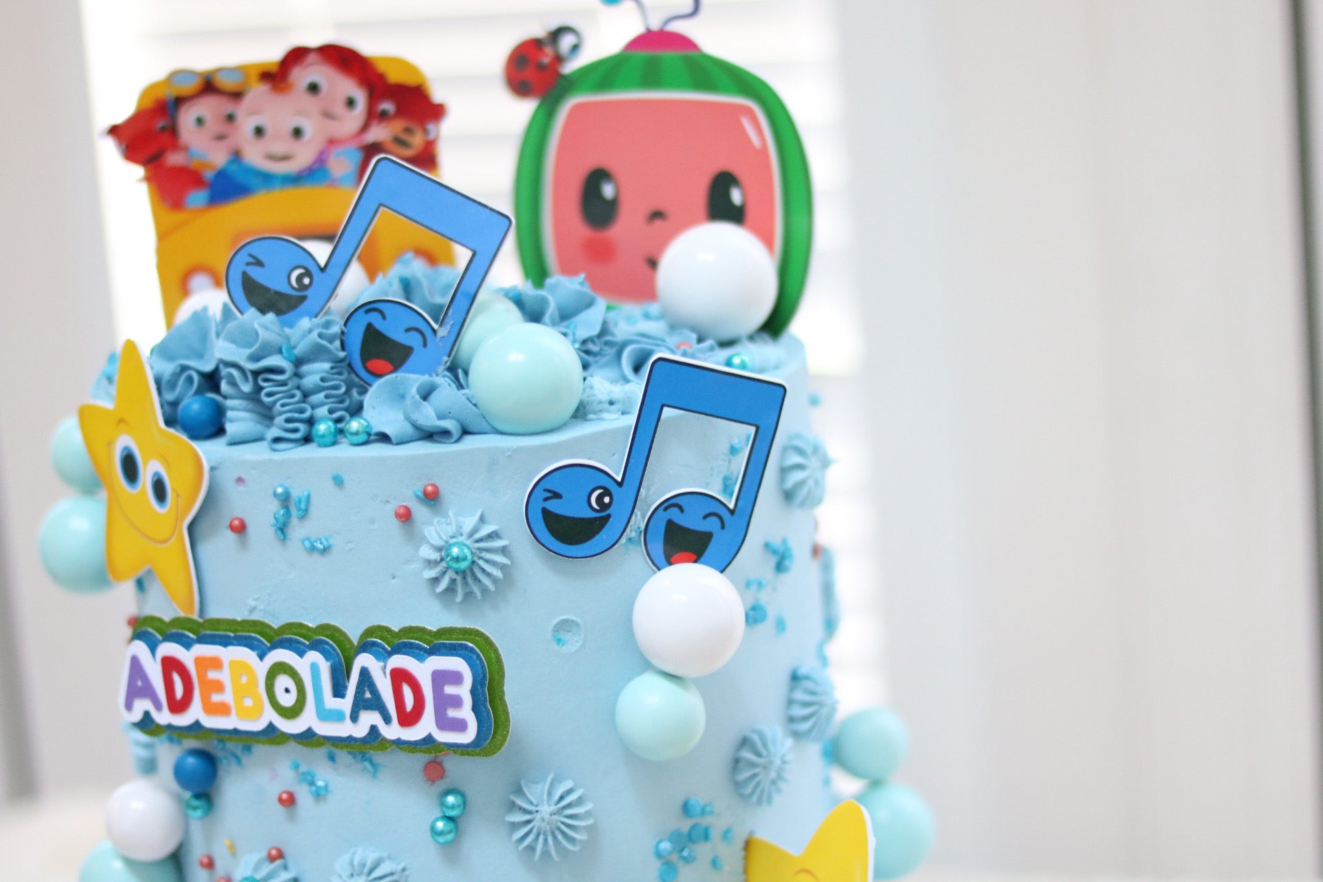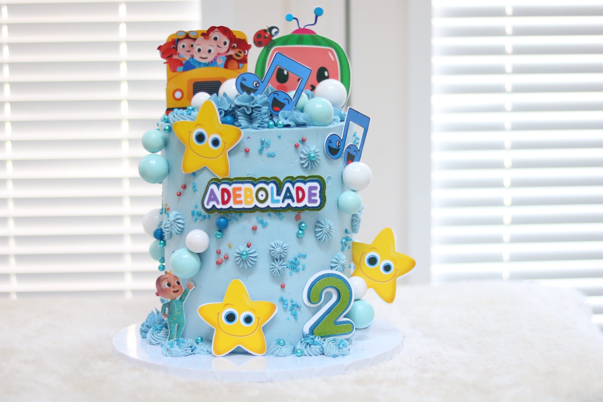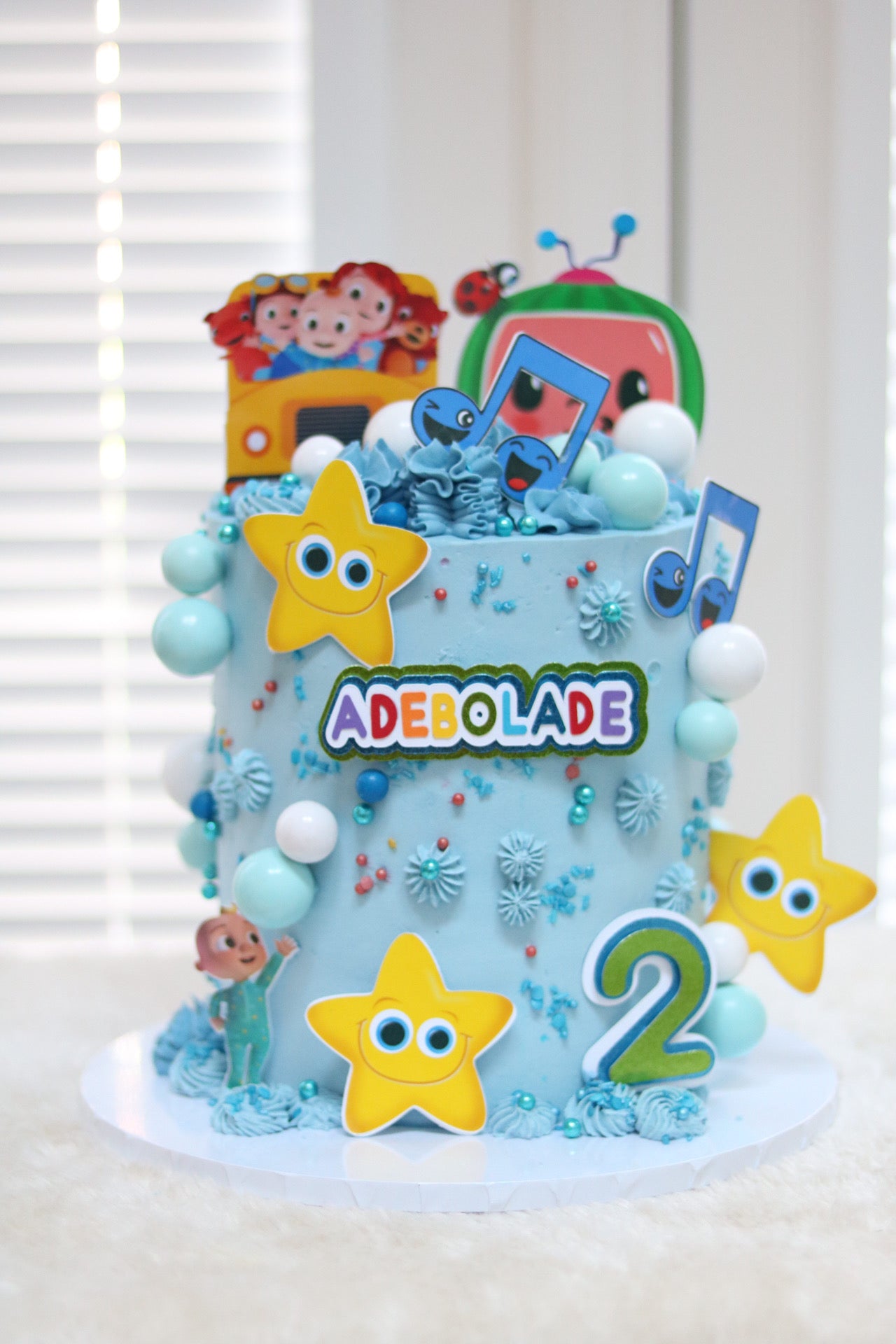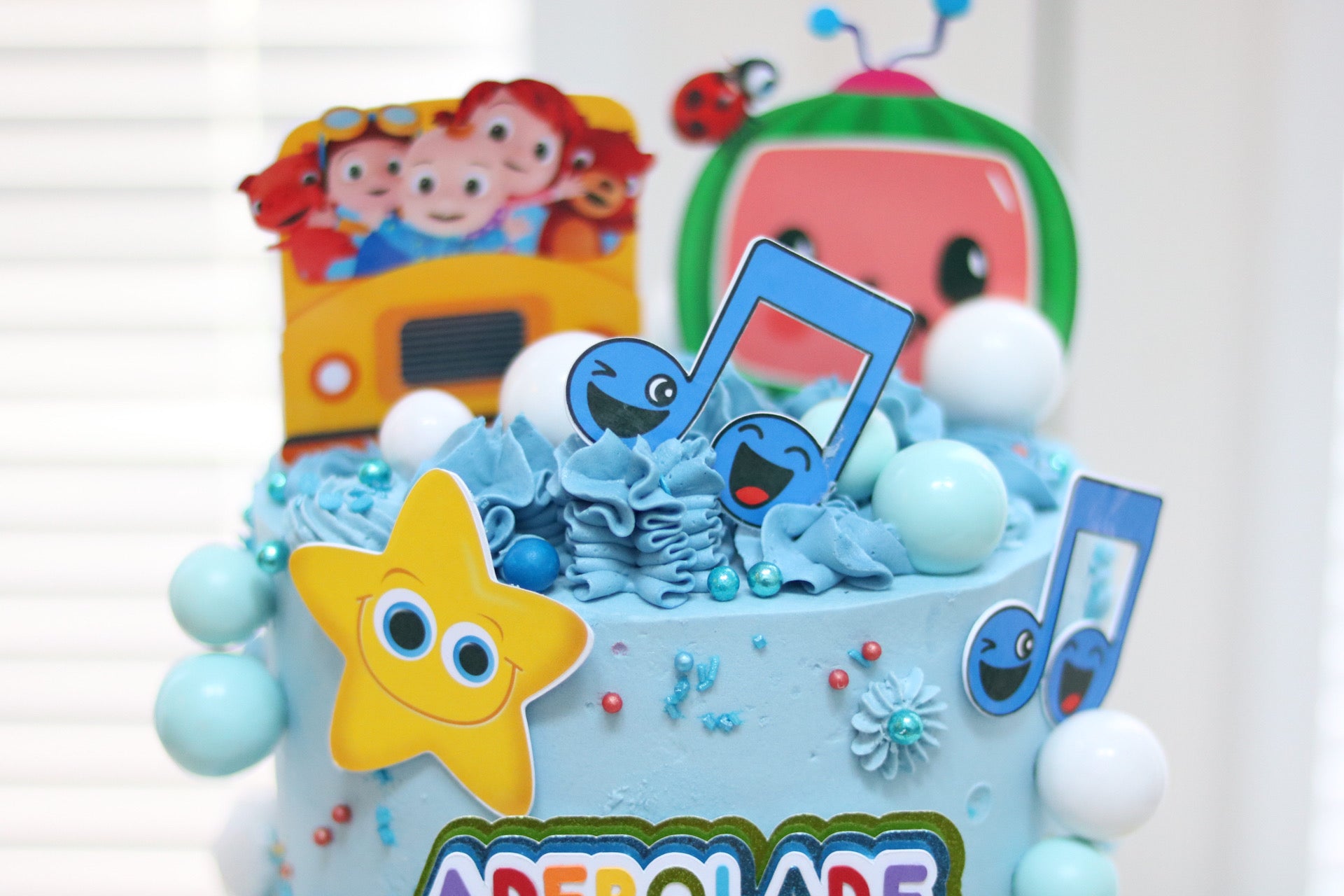 There is a separate listing for the Cake Topper- https://adeleinecodesigns.com/products/cocomelon-cake-topper