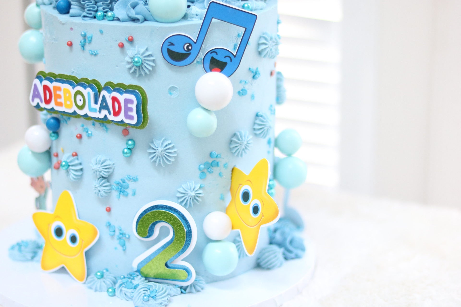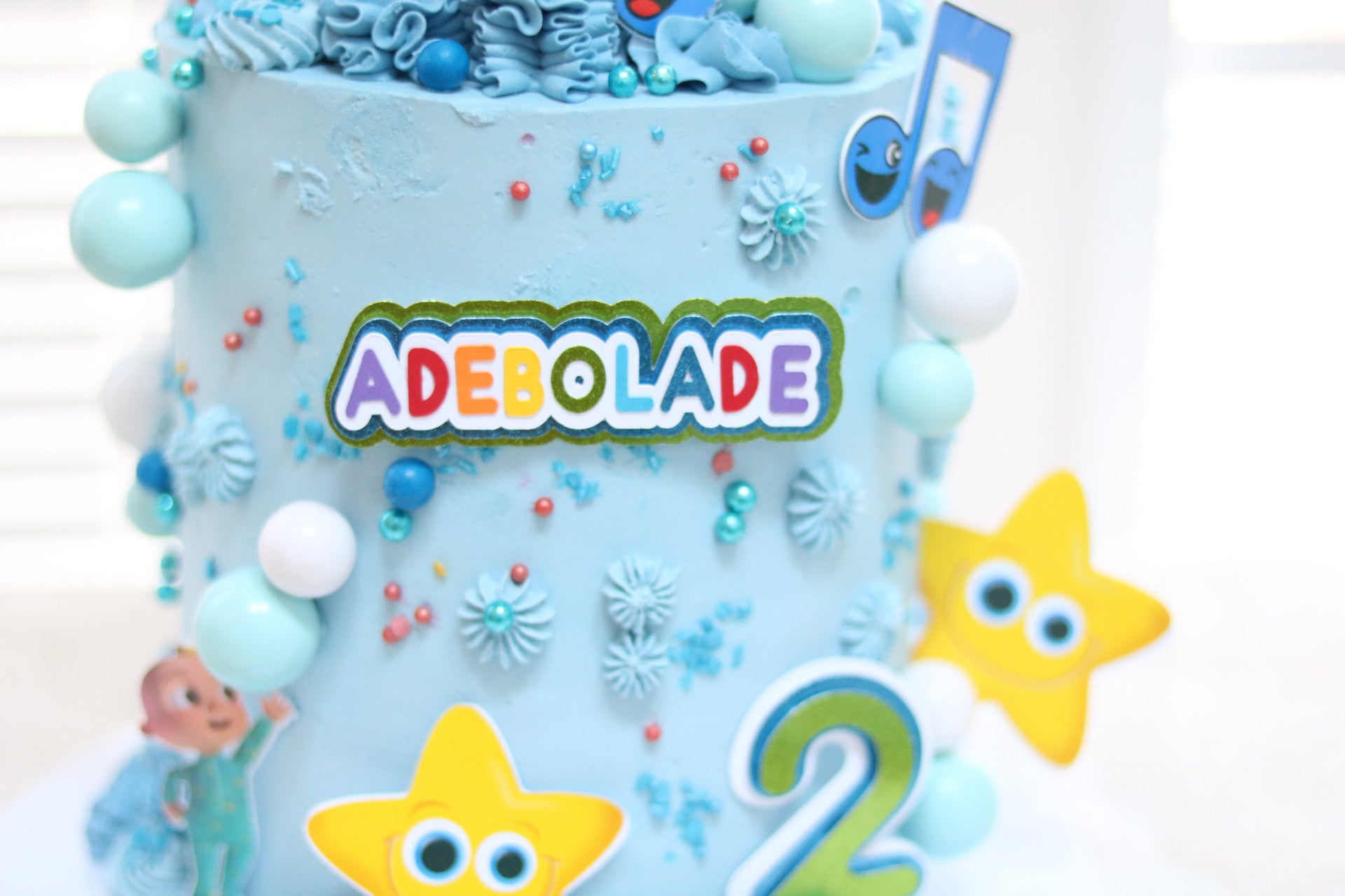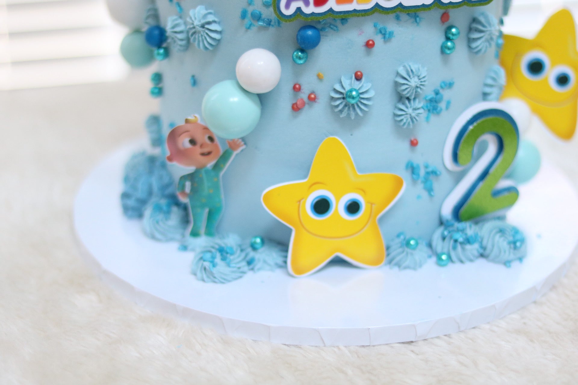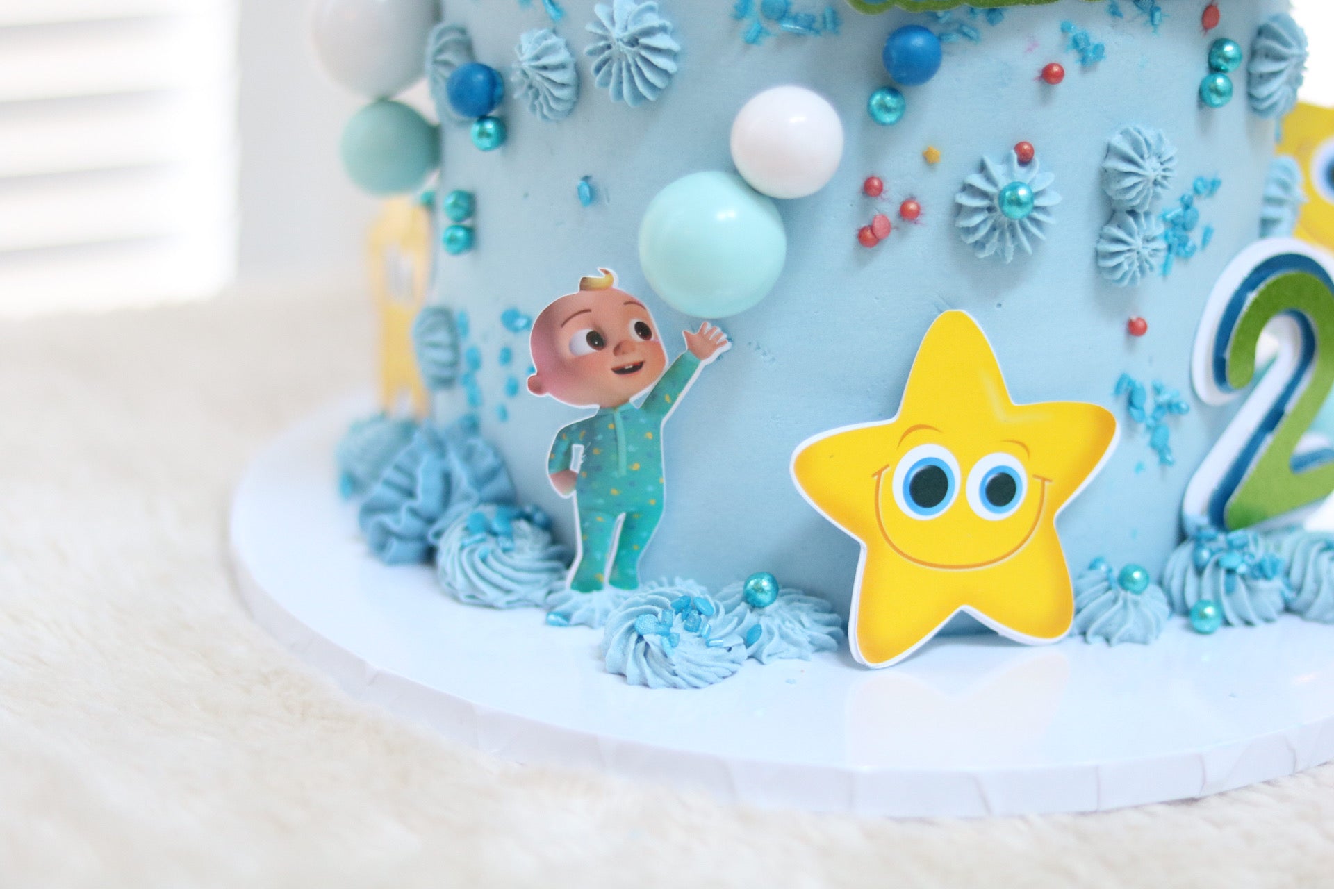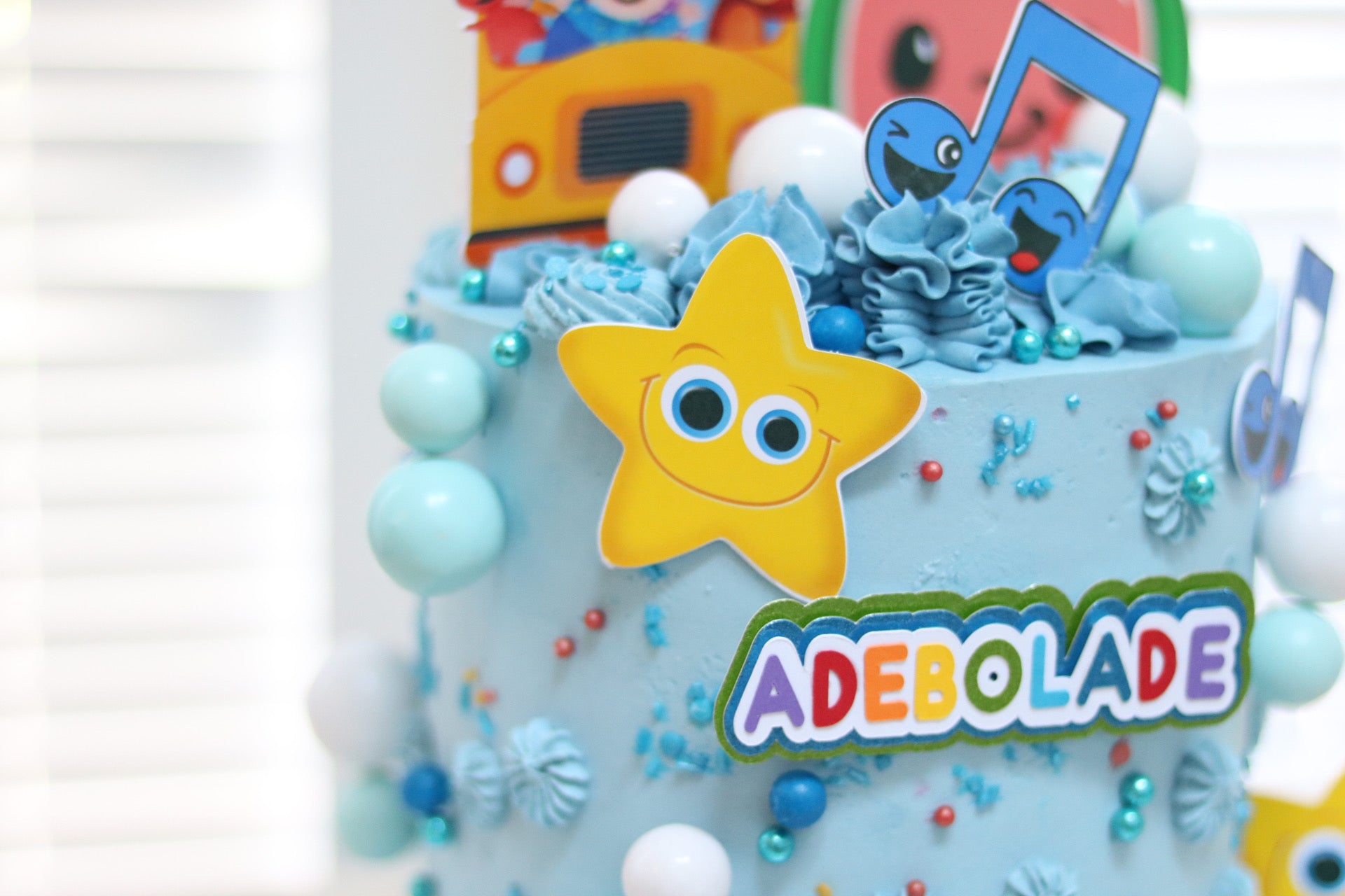 There is a separate listing for the Cake Topper- https://adeleinecodesigns.com/products/cocomelon-cake-topper