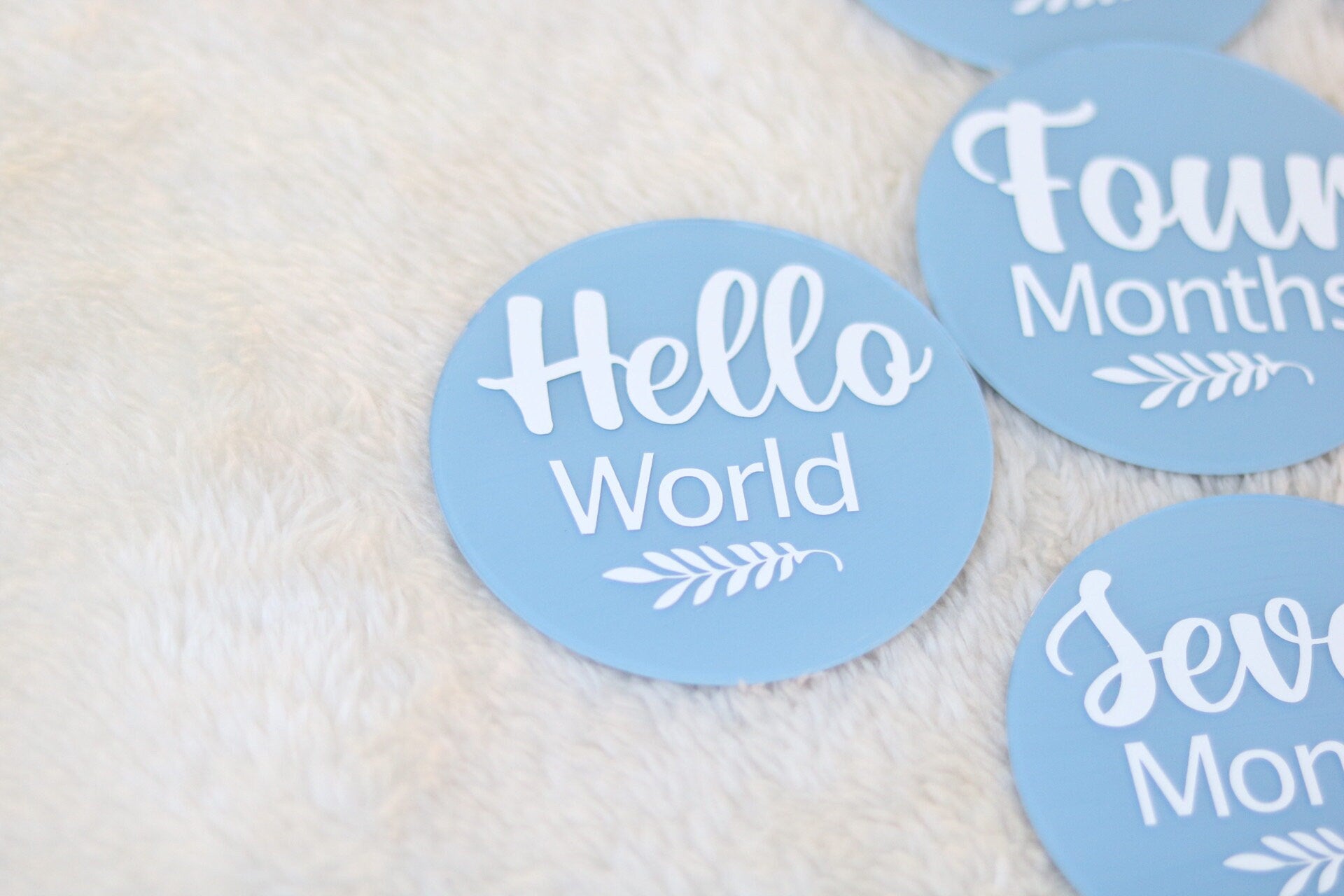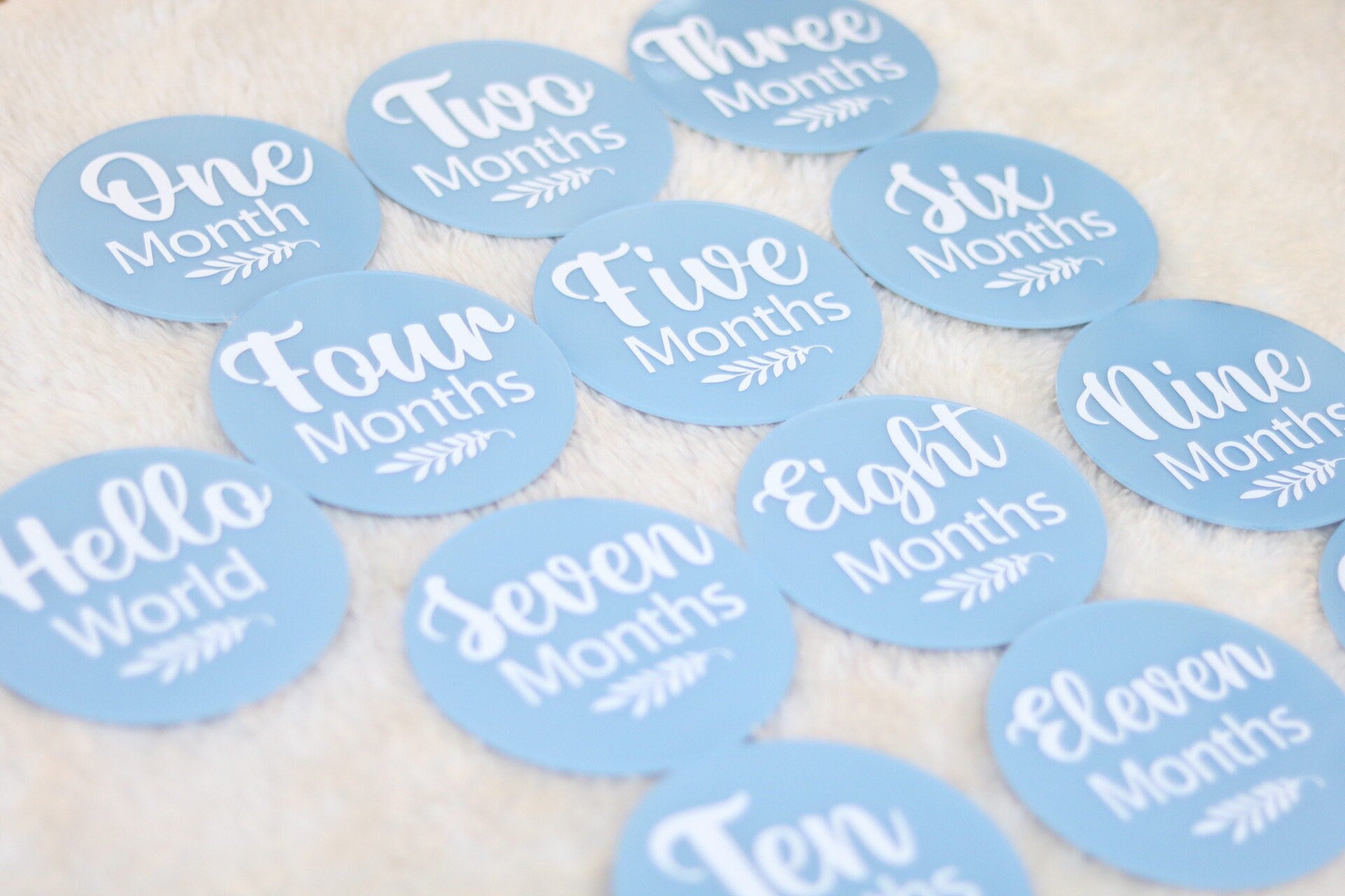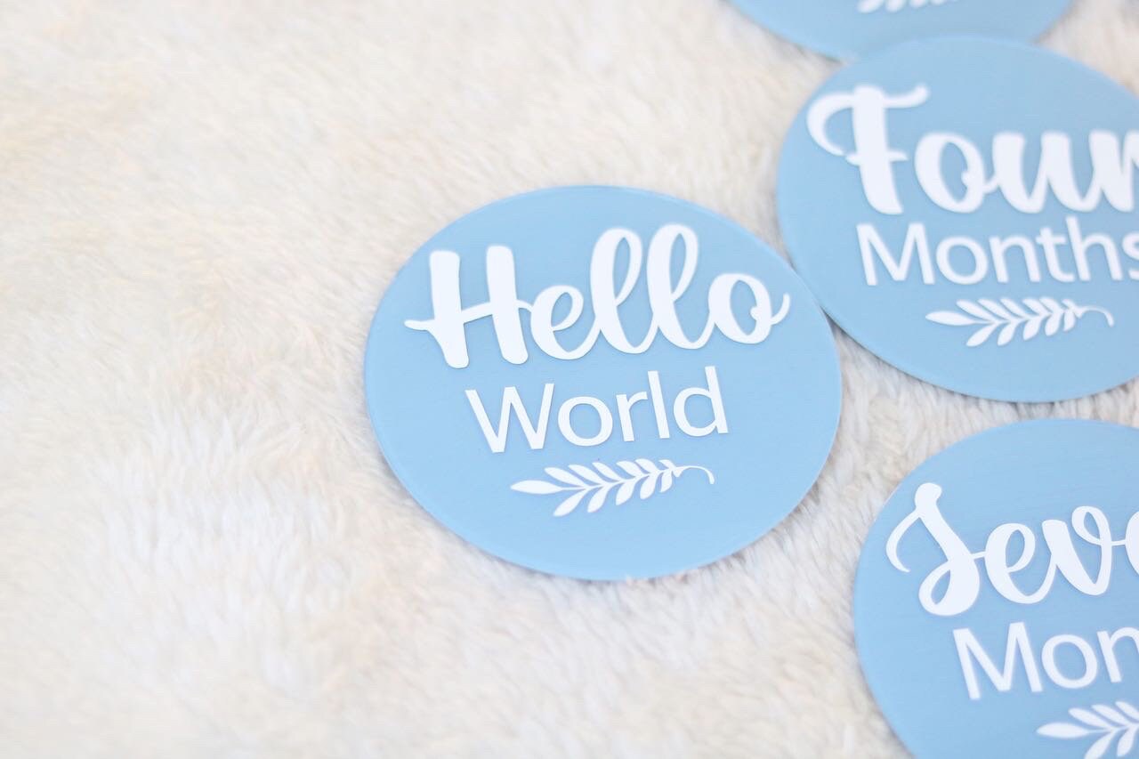 Personalised Acrylic Baby Milestone Rounds/Discs made to order featuring milestones from one month through to one year old . There is a Hello World included. It is beautifully packaged in a keepsake box which can be personalised with baby's name. They are made from high quality acrylic rounds/discs which are then handpainted with a chosen colour (if you need a different colour that's not listed, pleasee contact seller). In the box, you get 13 Acrylic rounds from Hello World through One Month to One Year Old. There is a similar listing which has a birth announcement where you can add in baby's name, weight, height and date of birth (please check other listing for this birth announcement sign). Add personalisation in the box below which should include colour that you wish to have it painted. If you have any questions, let me know in a message. Thank you.
