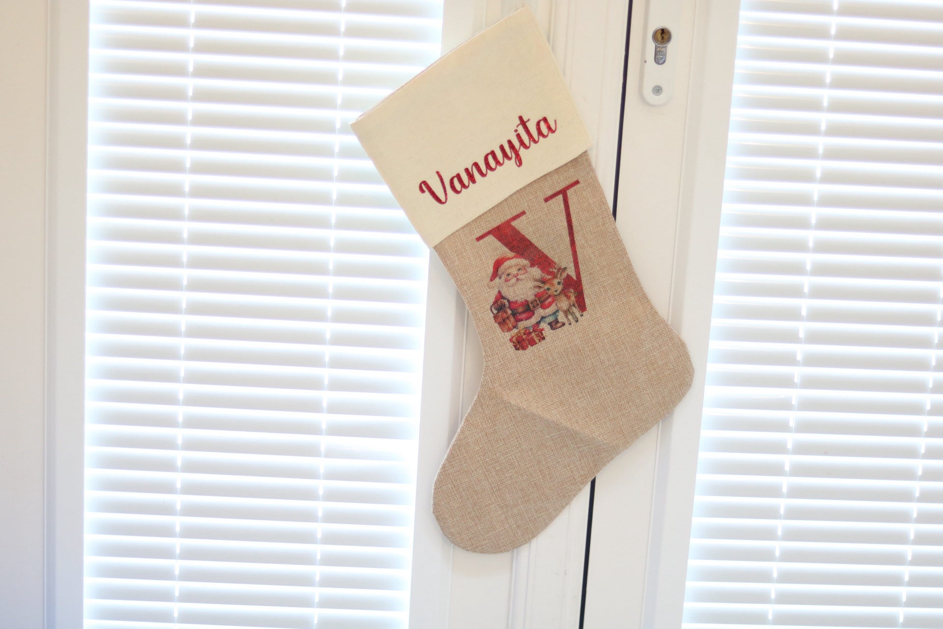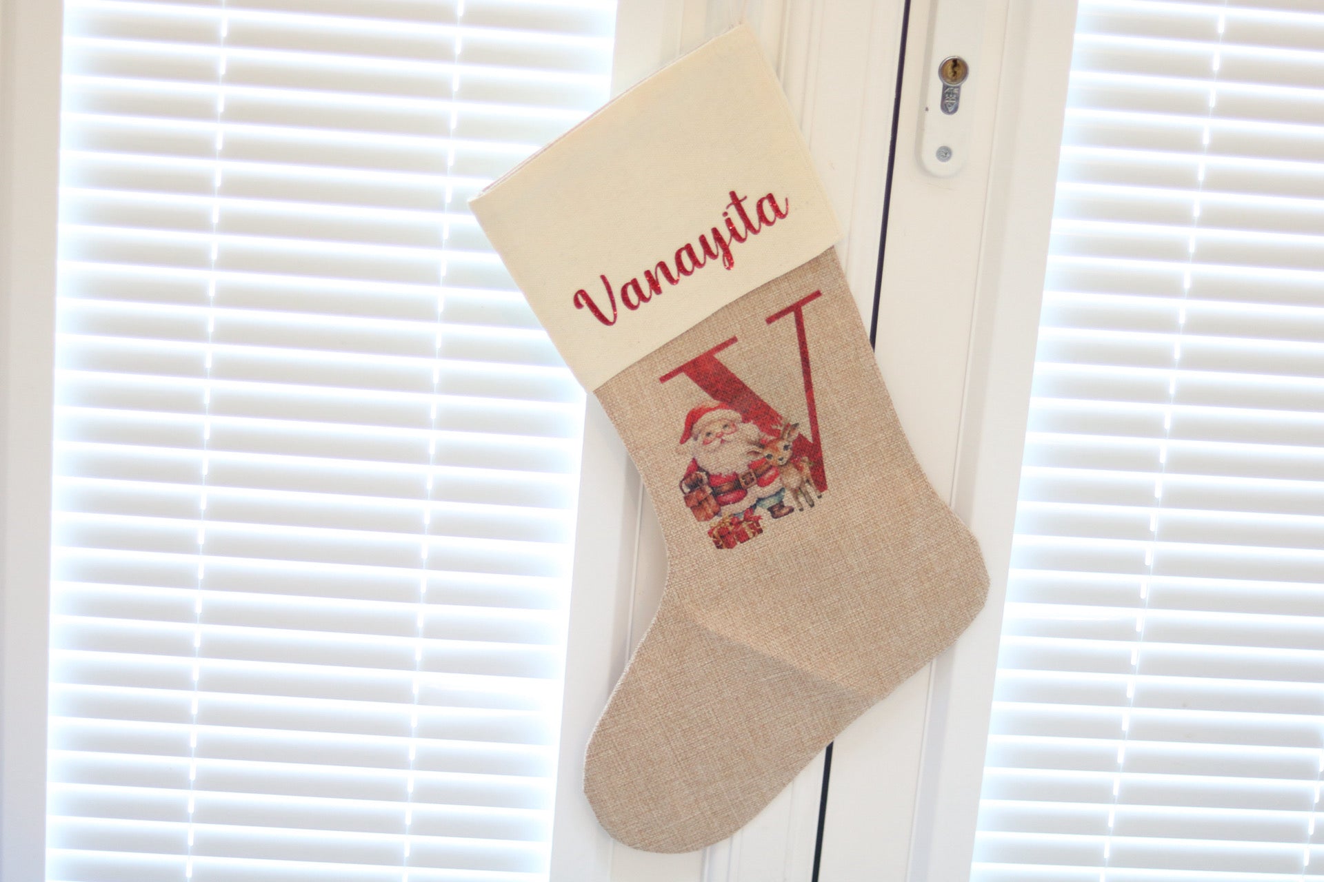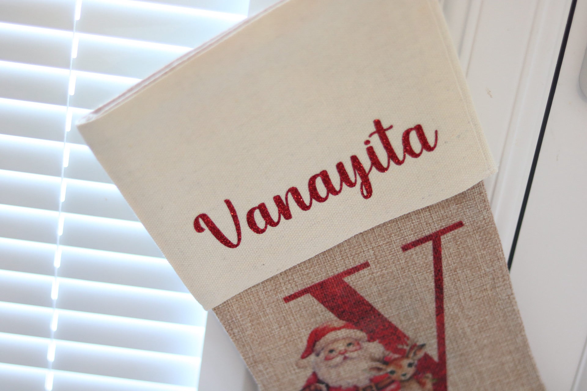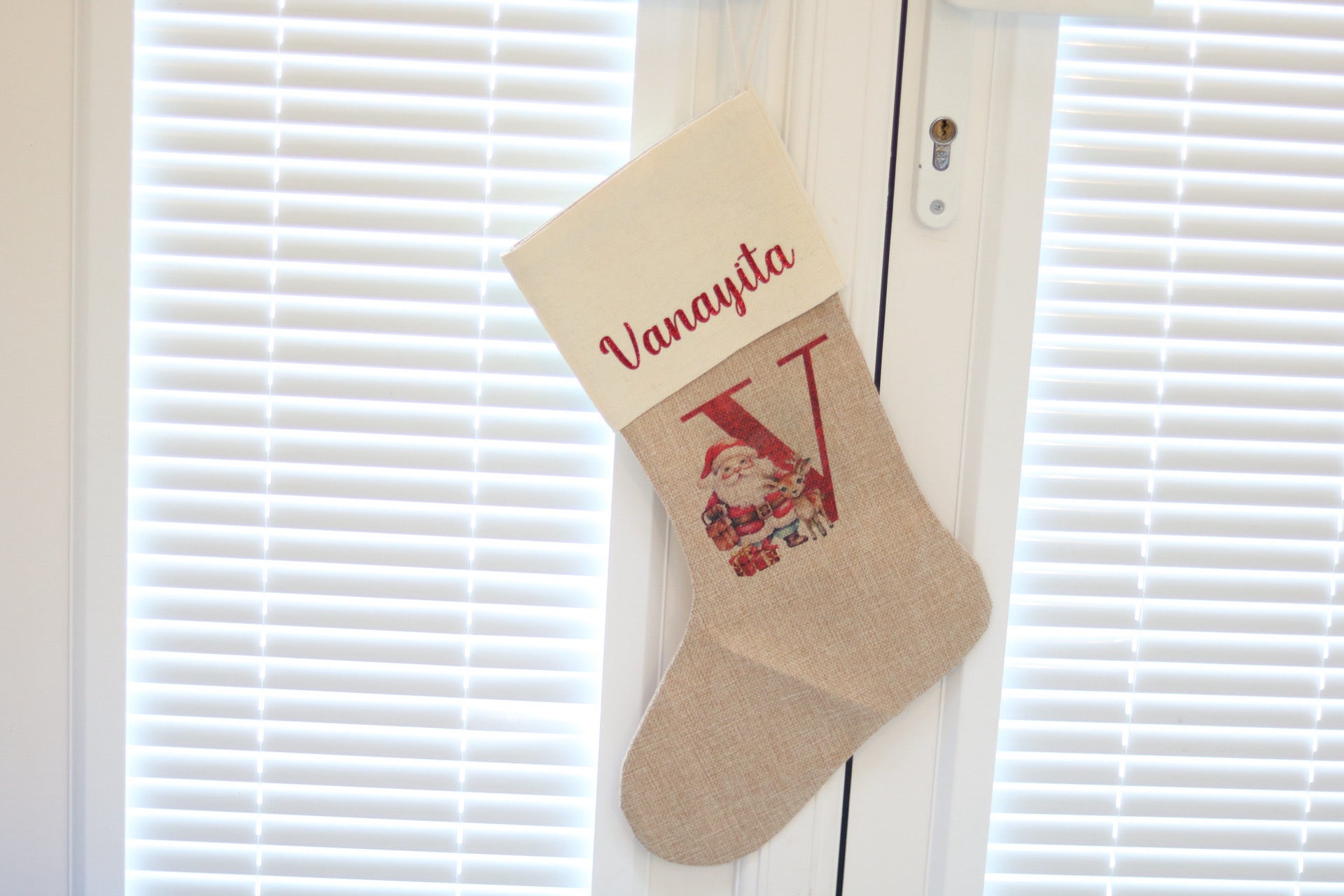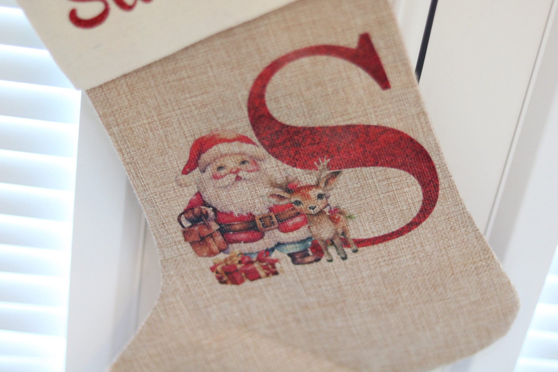 The stocking is made from high quality Burlap and a Linen lining at the top. The print is sublimated onto the stocking so it will remain as vibrant.